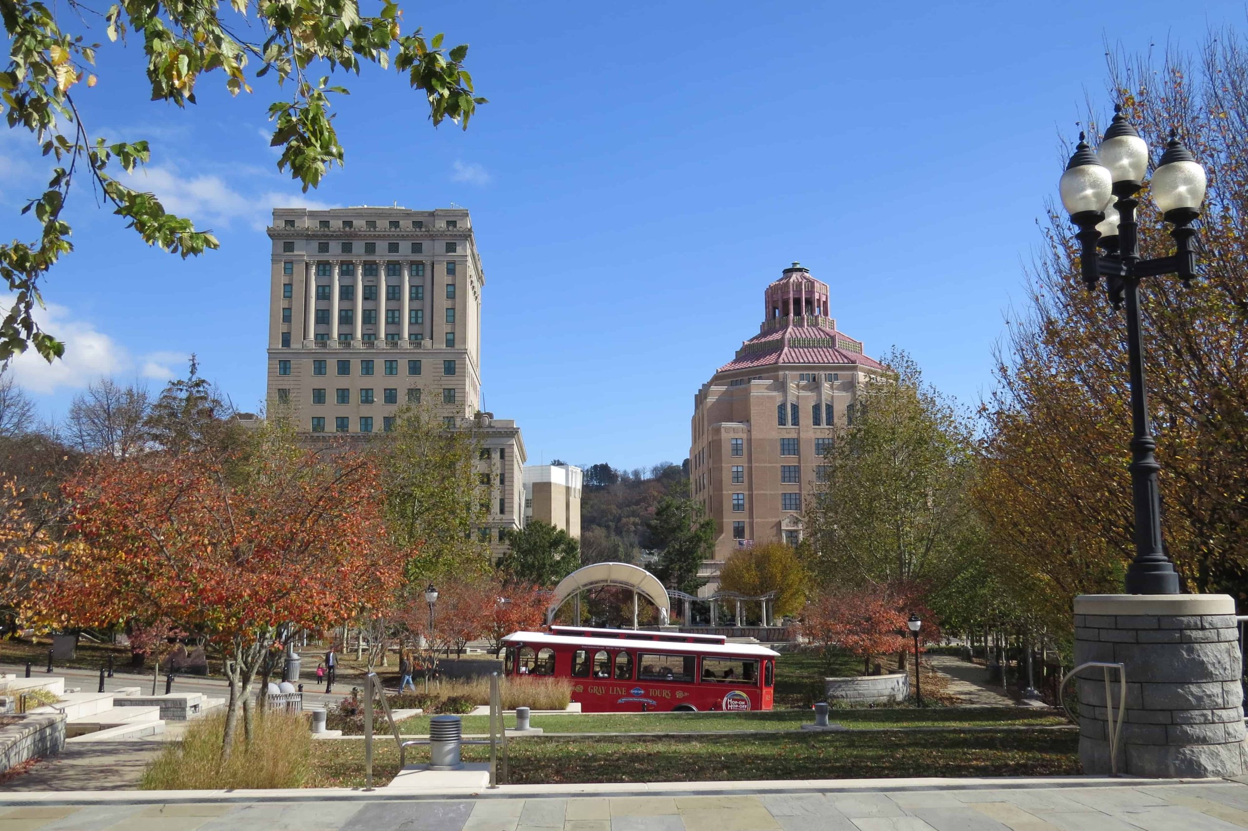 On the far side of the park are the Art Deco Asheville City Hall and Buncombe County Courthouse.