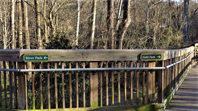 Continuing down the road, you’ll come to the large intersection with Cole Mill Rd. A quick left here will take you to the main entrance of the park, home to Cox Mountain Trail with the famed suspension bridge.